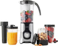 - FULL ACCESSORY SET INCLUDED – Comes with everything you need: 1 x 1L blending jug with handle and spout, 1 x 500ml cup with sports lid and handle, 1 x 500ml blending jar, 1 x 300ml blending jar, and a juicing filter system. All lids are leak-proof and BPA-free—ideal for prepping, storing, and carrying your drinks.